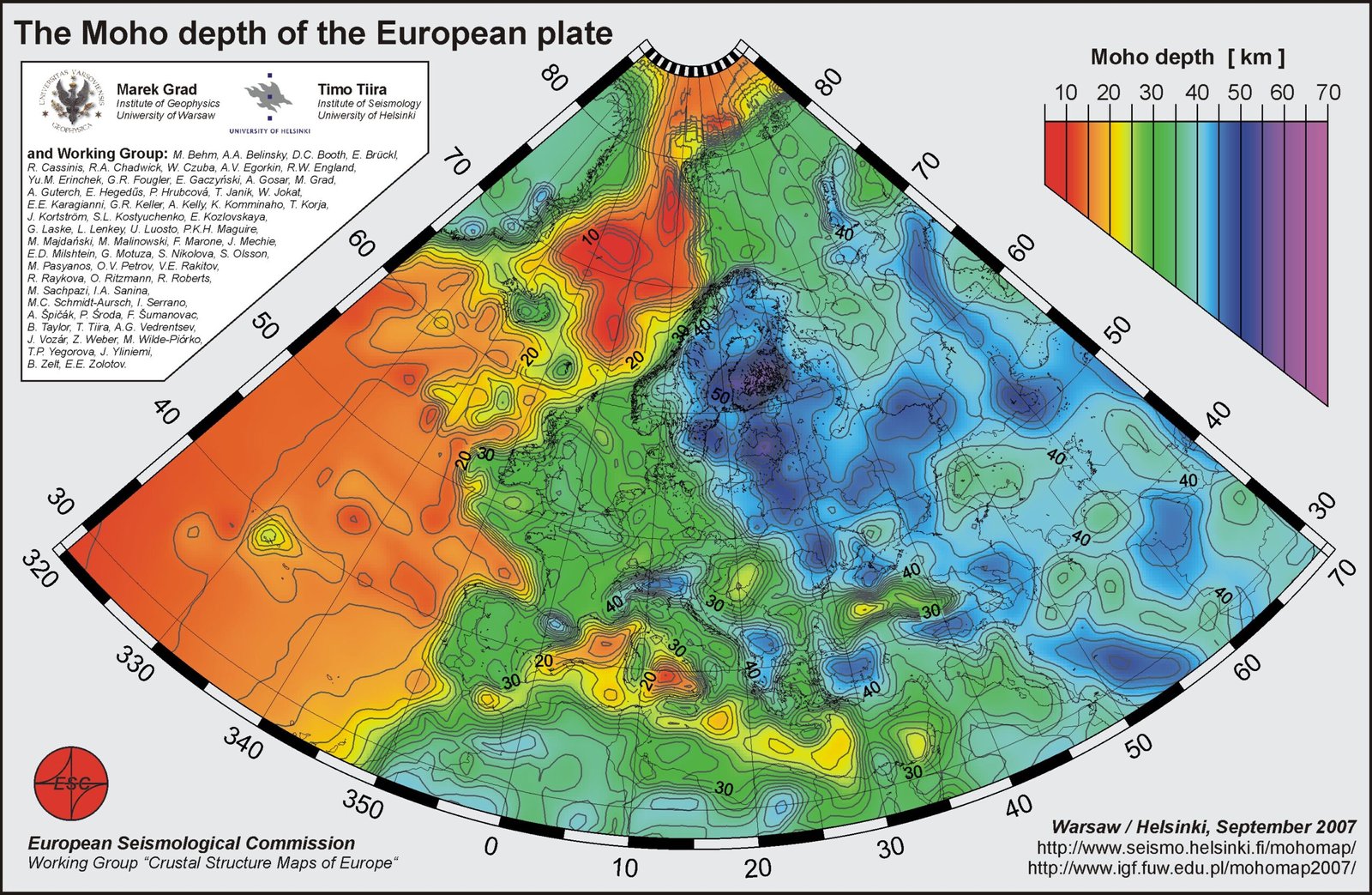 Bu da ilave olsun, işin gerçeği biraz araştırma yapınca, köre attım topalı vurdum. Avrupa plakasının Moho derinliğini ele alan bir harita daha var. GEMMA kadar hassas olmasa da, bu çalışma Avrupa sınırlarını aşıyor. Unutmayın, jeotermal çalışan biri için kabuk kalınlığı çok önemlidir.